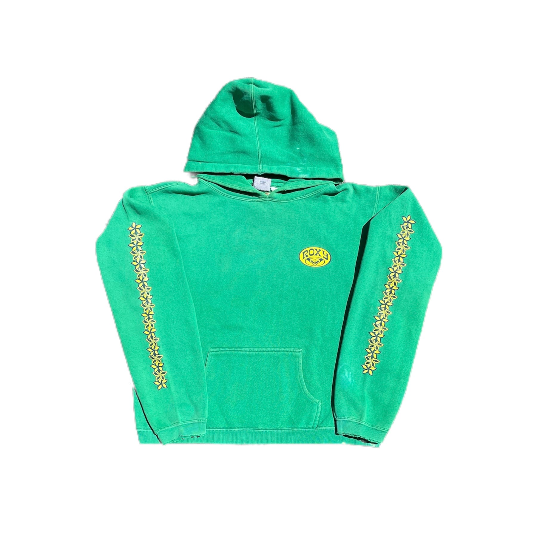 90s ROXY パーカー バックプリント 袖プリント 花柄 ブリーチ グリーン 緑 レディース 古着